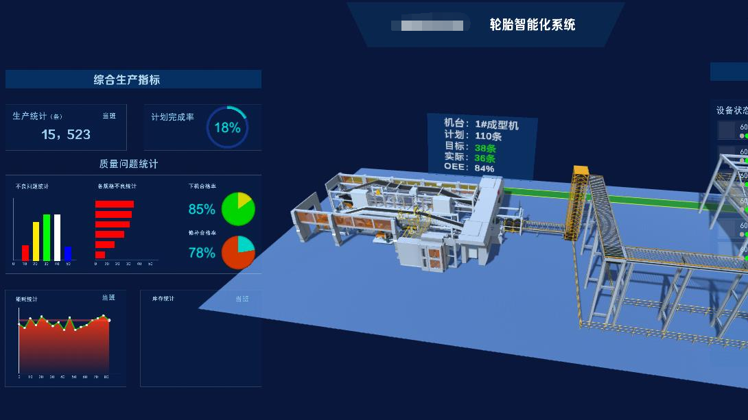 輪胎行業(yè)數(shù)字化升級(jí),智能化集中管控系統(tǒng)3D可視化,實(shí)現(xiàn)生產(chǎn)計(jì)劃、設(shè)備狀態(tài)、質(zhì)量管控、人員管理等信息可視化